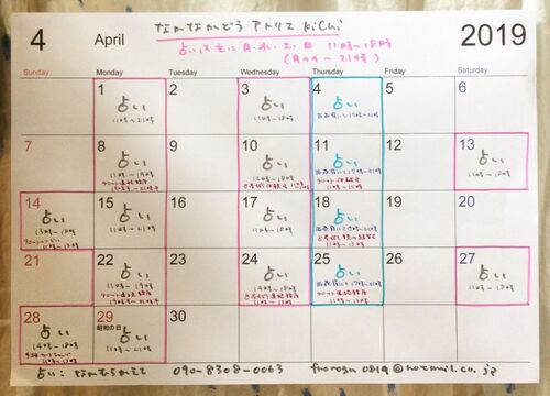 4月!新学期です。いや学校行ってるわけじゃないんだけど…まあ。占いやってますなかむらの2019年4月のスケジュールです。どなたか必要な方に届きますように。 通常、吉祥寺「なかなかどう アトリエ kiChi」というスペースにてあれこれしております。占いと人…